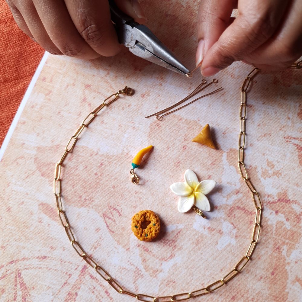 Chaque fleur est façonnée en argile polymère, pour capturer l’éclat simple du frangipanier.