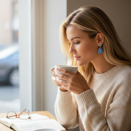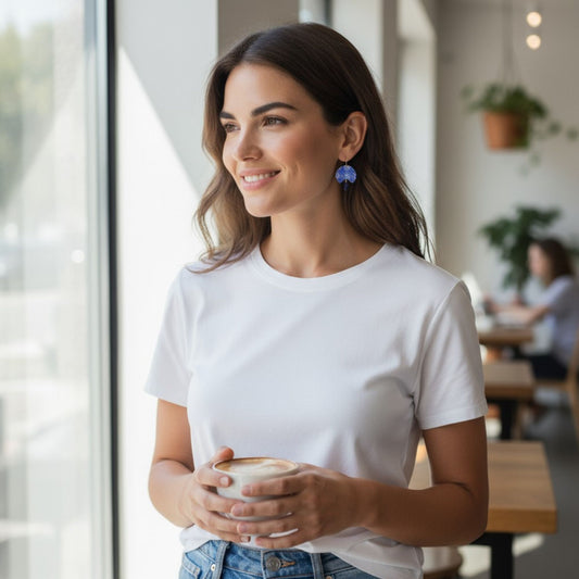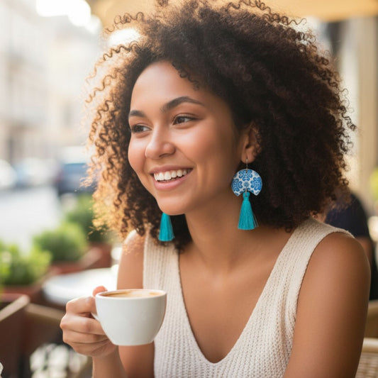 Chaque paire de boucles d’oreilles est une pièce unique, modelée et assemblée à la main dans mon atelier, puis décorée d’un motif bleu différent d’une boucle à l’autre pour conserver l’esprit authentique des carreaux artisanaux.