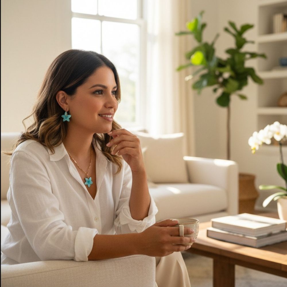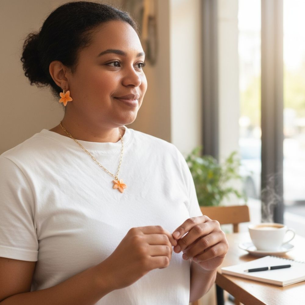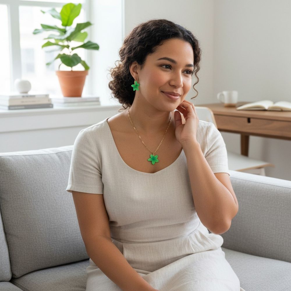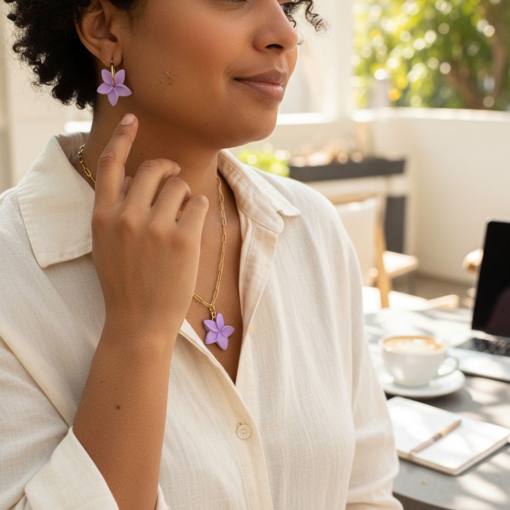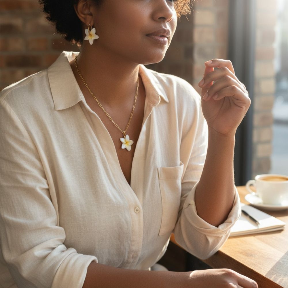 Duo Frangipanier unit un collier et une paire de boucles, liés par la même fleur de frangipanier. Non pas juste pour faire joli. Mais pour "honorer le lien" : celui que les mots ne savent pas toujours dire.